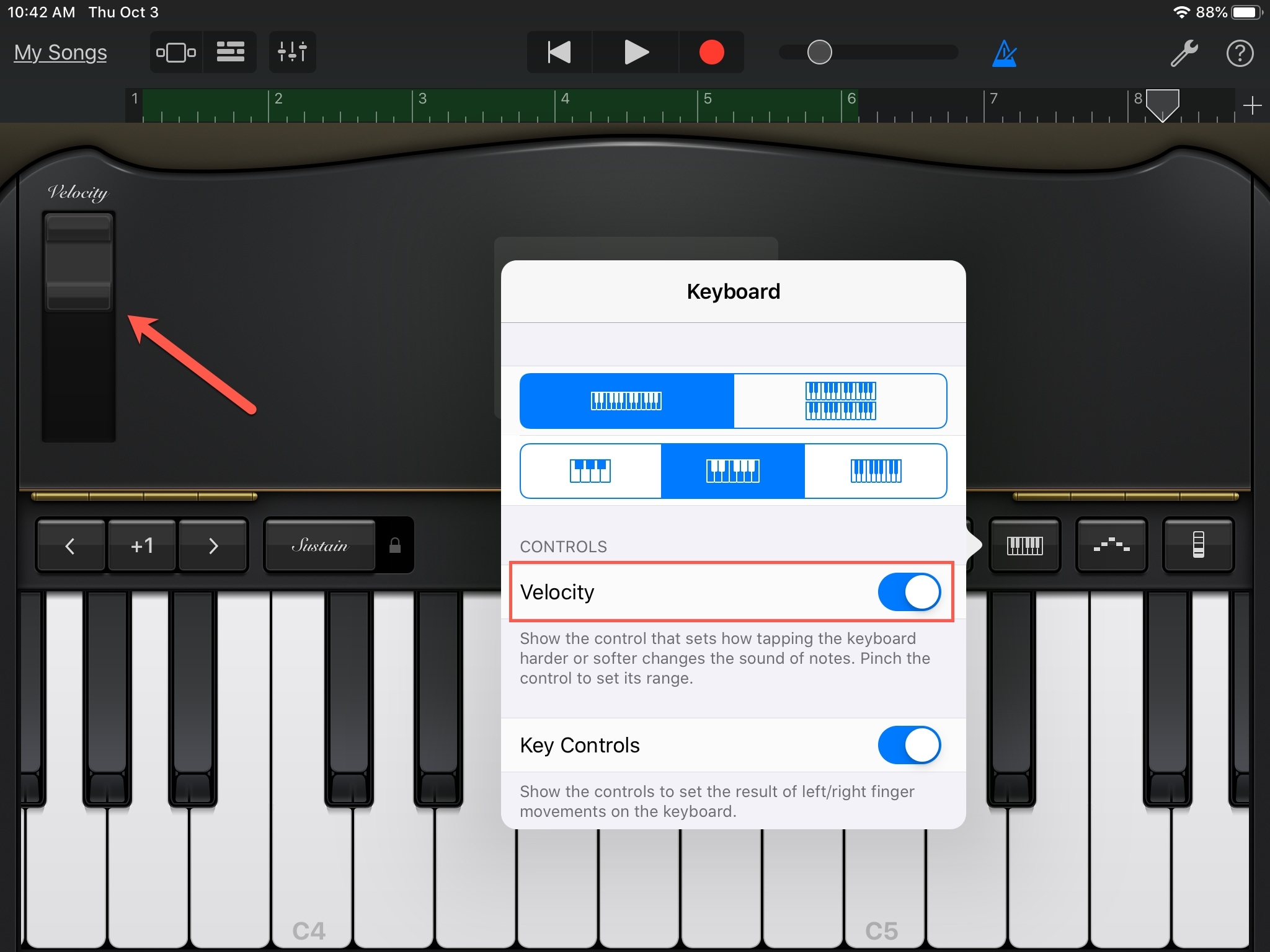 Si quieres cambiar el grado de velocidad de las notas que vas a tocar en el teclado, haz clic en el botón Smart Controls en la parte superior izquierda de la ventana de GarageBand.